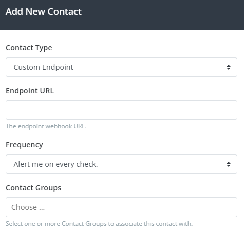 Select Custom Endpoint from the Contact Type drop-down, enter your webhook URL in the Endpoint URL field, select a Frequency, and select one or more Contact Groups to associate with this new contact.
