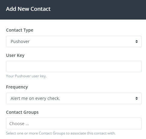 Select Pushover from the Contact Type drop-down, enter your Pushover user key in the User Key field, select a Frequency, and select one or more Contact Groups to associate with this new contact.